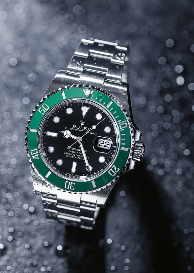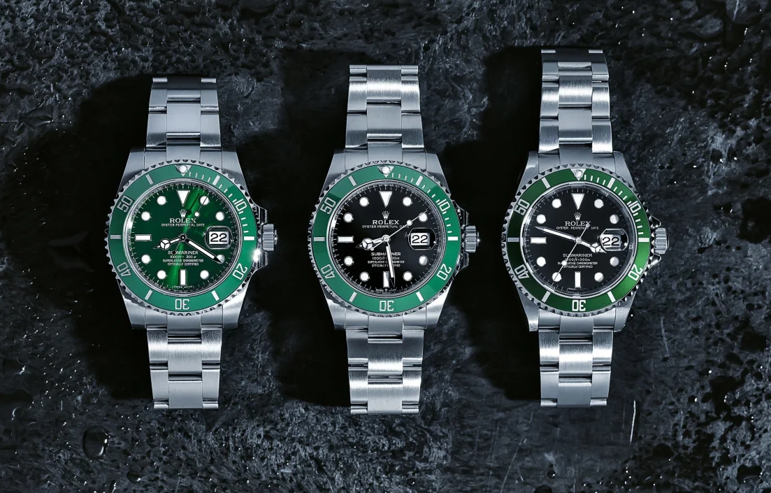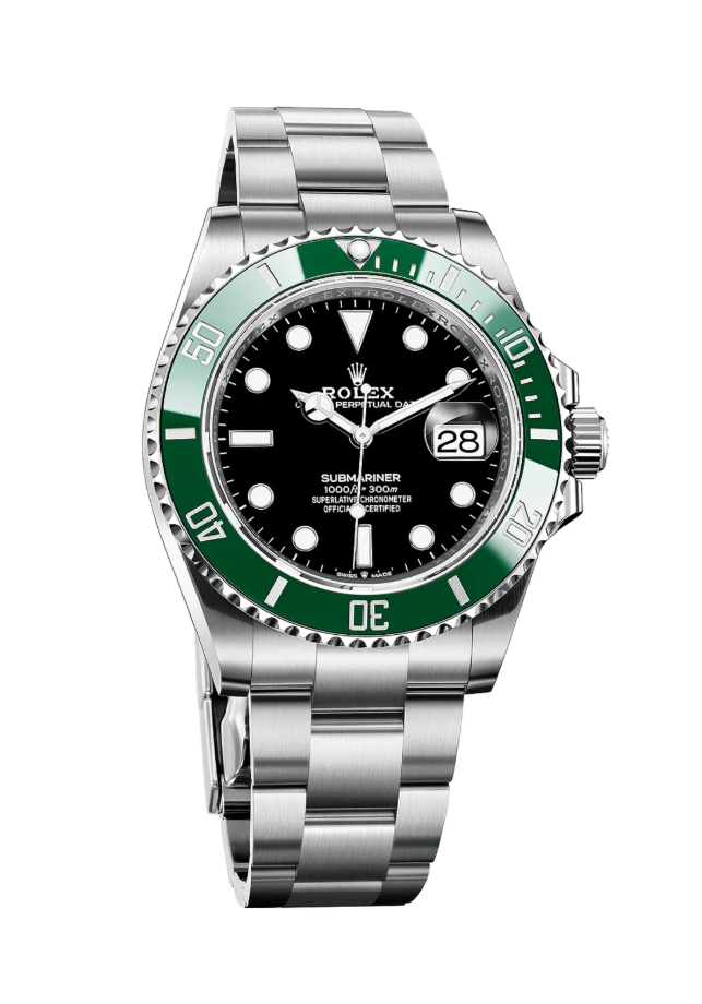 But why is the hype around the green version by far the greatest, even though every Submariner model has been updated? For one, it is the only steel version that is visibly different from its predecessors. The “Hulk,” which it replaces, has a green sunburst dial in addition to the green bezel. The dial of the new model is black. Rolex has revived a color combination that preceded the Hulk, which existed from 2003 to 2010 and was known by the nickname “Kermit,” which had a black dial and green aluminum bezel inlay. A second reason is that these two green models were already much more popular than their black counterparts in the Submariner collection. Interestingly, Rolex has also returned to the earlier, more elegant case shape seen with the Kermit. The “Maxi” case with its broad lugs and large crown guard was introduced with the launch of the ceramic bezel.