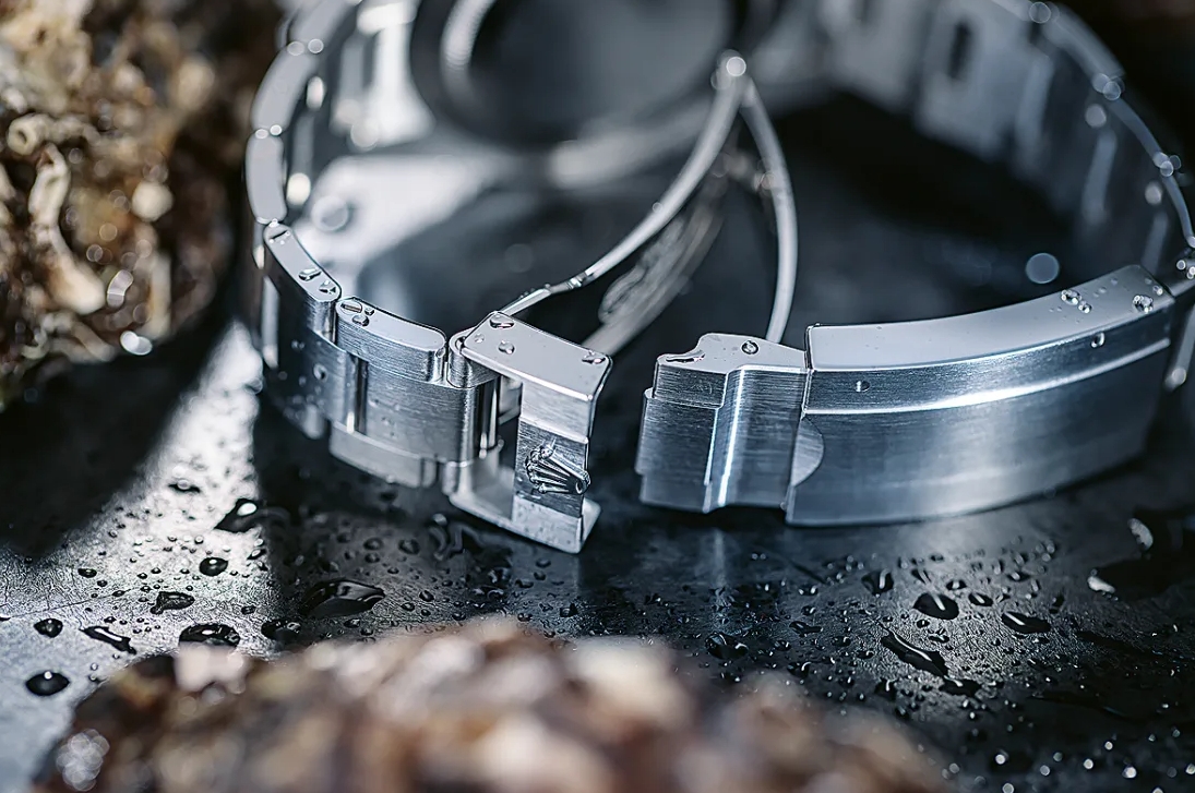 The smooth caseback, clean inner surface of the clasp and supple feel of the steel bracelet all contribute to watch’s wearing comfort. The individual links of the bracelet are curved to fit the shape of the wrist. Spaces between the links remain constant, even when the bracelet is bent, which prevents pinching or pulling hairs.